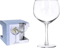 Deze set bevat 4 Gin Tonic glazen met een inhoud van 650 ml en een hoogte van 20 cm. De glazen hebben een brede kom en een lange steel, en worden geleverd in een doos. Ze zijn ook vaatwasserbestendig.