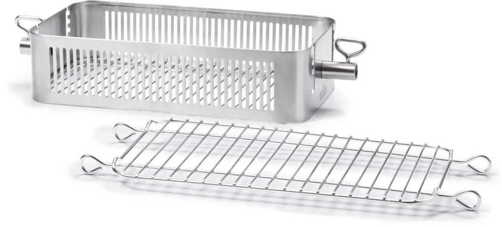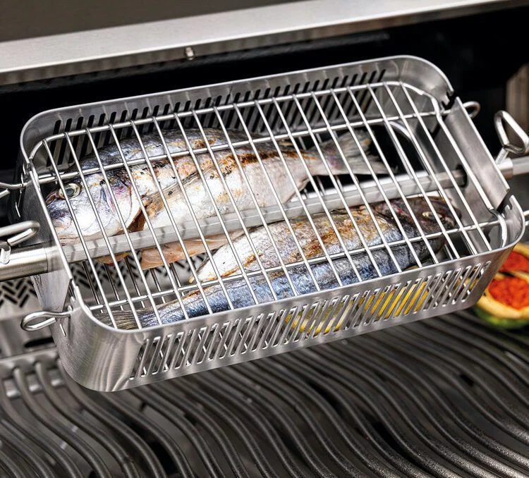 Deze verstelbare mand voor het draaispit van Napoleon is perfect voor het bereiden van grote stukken vlees, vis en groenten zoals, spareribs, lamsrack, hotwings en complete roast.
