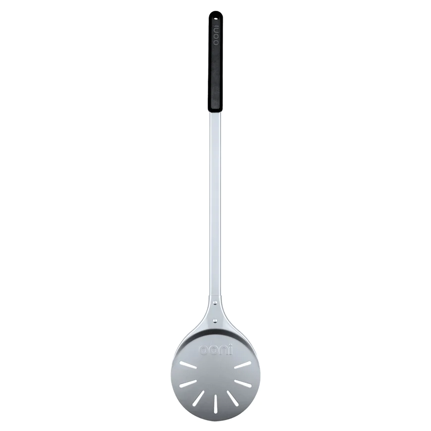 De perforaties in het oppervlak van de schep zorgen ervoor dat stoom kan verdampen en overtollig meel van de pizzabodem af kan vallen.