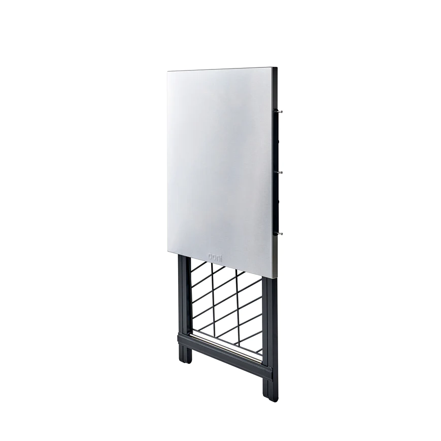 De opvouwbare tafel van Ooni wordt geleverd met een handige opbergplank en een gemonteerde hakenset voor het bewaren van de accessoires.