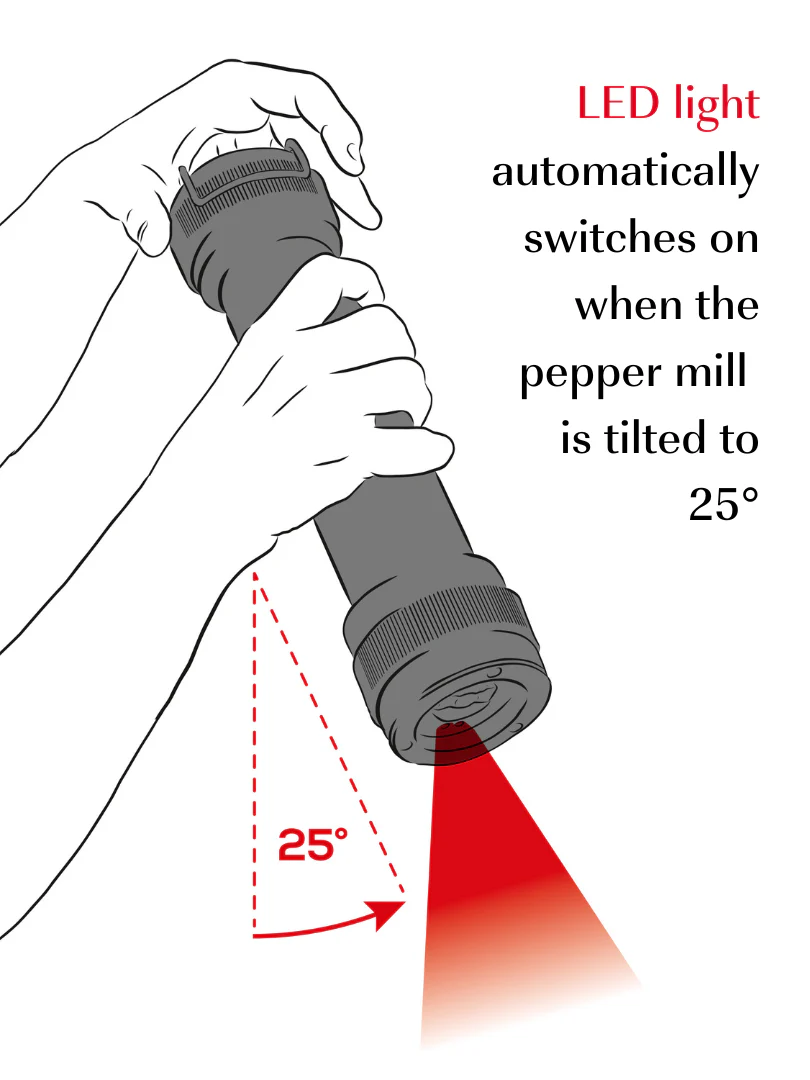 Deze molen is speciaal ontworpen voor buitengebruik. De combinatie van rubberen elementen en een roestvrijstalen voet zorgt ervoor dat hij tegen een stootje kan. En wat echt cool is: de ledverlichting! Deze gaat automatisch aan als je de molen kantelt en dooft geleidelijk wanneer je hem weer rechtop zet. De verlichting kan tot wel 20.000 keer gebruikt worden voordat de batterijen vervangen moeten worden.