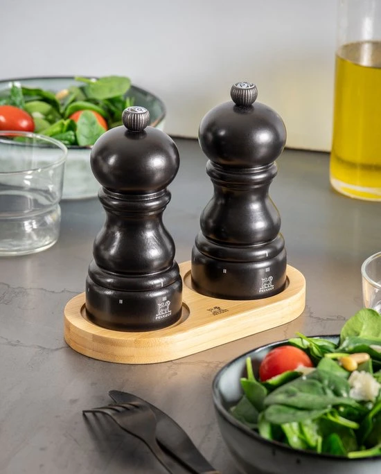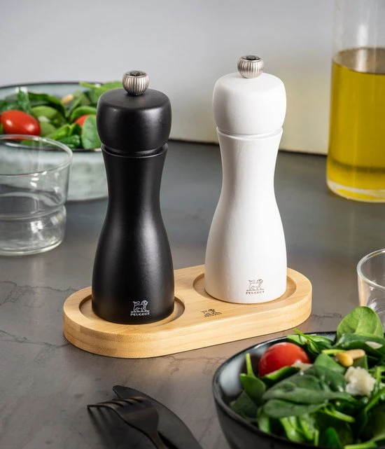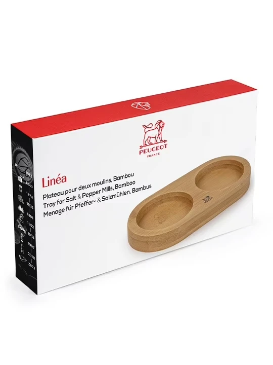 Met het naturel bamboe Linéa dienblad van Peugeot kunt u de peper- en zoutmolens in stijl vervoeren, serveren en bewaren