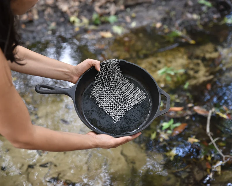 Door het patroon van de geschakelde RVS ringen scrub je in een handomdraai alle aangebakken resten uit je gietijzeren producten!